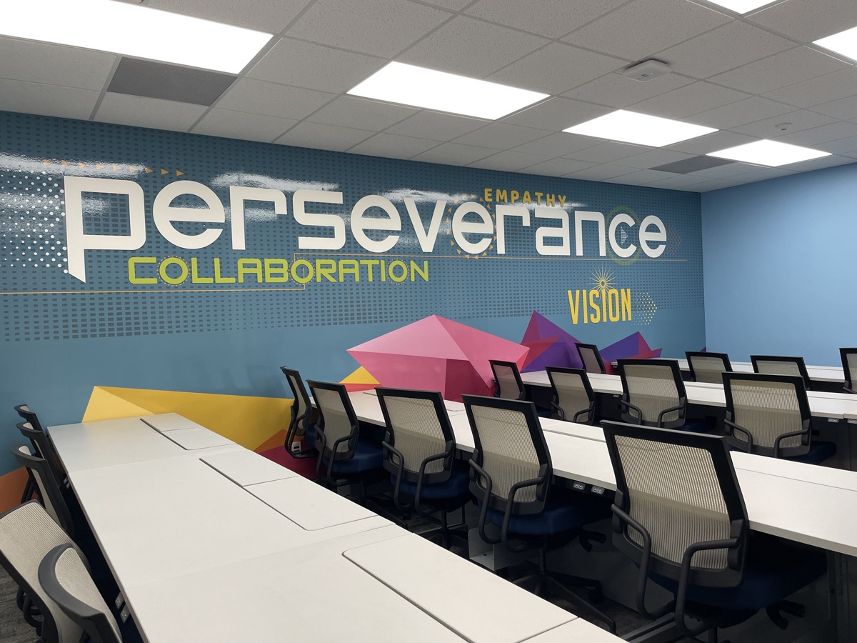 Designed by Able & Co., in collaboration with NCWorks NextGen Ambassadors, the new space intends to entice and engage younger customers. The Emerging Workforce Center contains features a computer lab to be utilized for workshops, trainings, and personal use for participants when needed, as well as a Virtual Reality space for the upcoming VR Initiative.